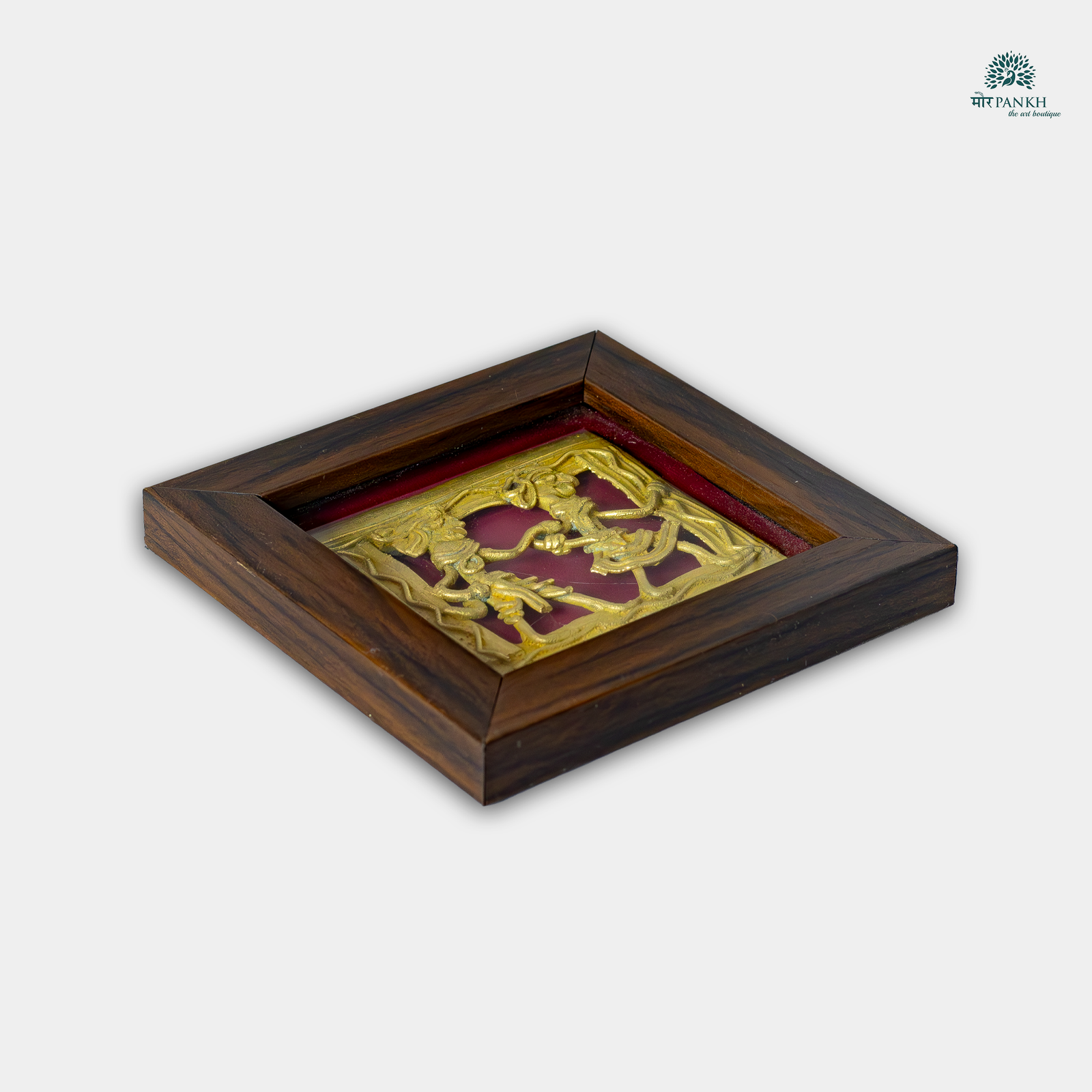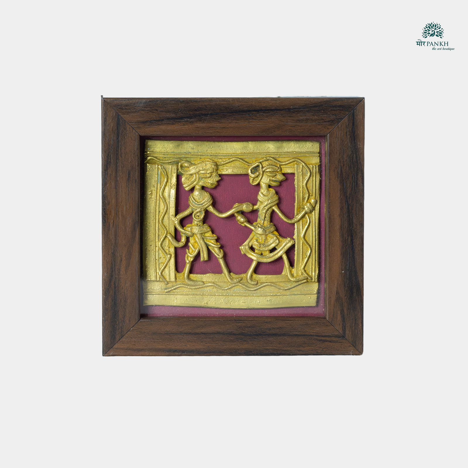 Infuse rustic charm into your space with this handcrafted Dhokra art coaster. Featuring a tribal couple dancing in celebration, the brass relief is framed in rich wood, blending utility with tradition. Whether used as a functional coaster or a miniature wall accent, this piece brings heritage and warmth to modern living. A perfect fusion of folk art and décor!