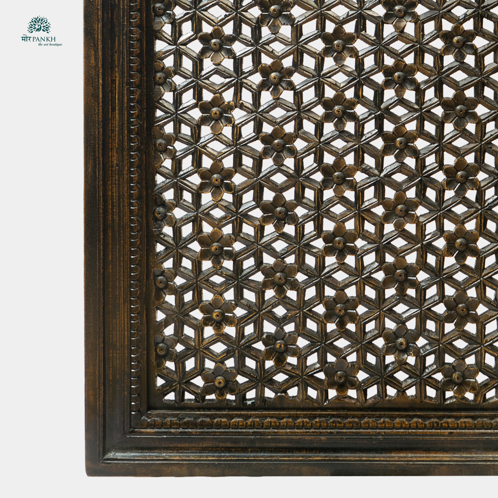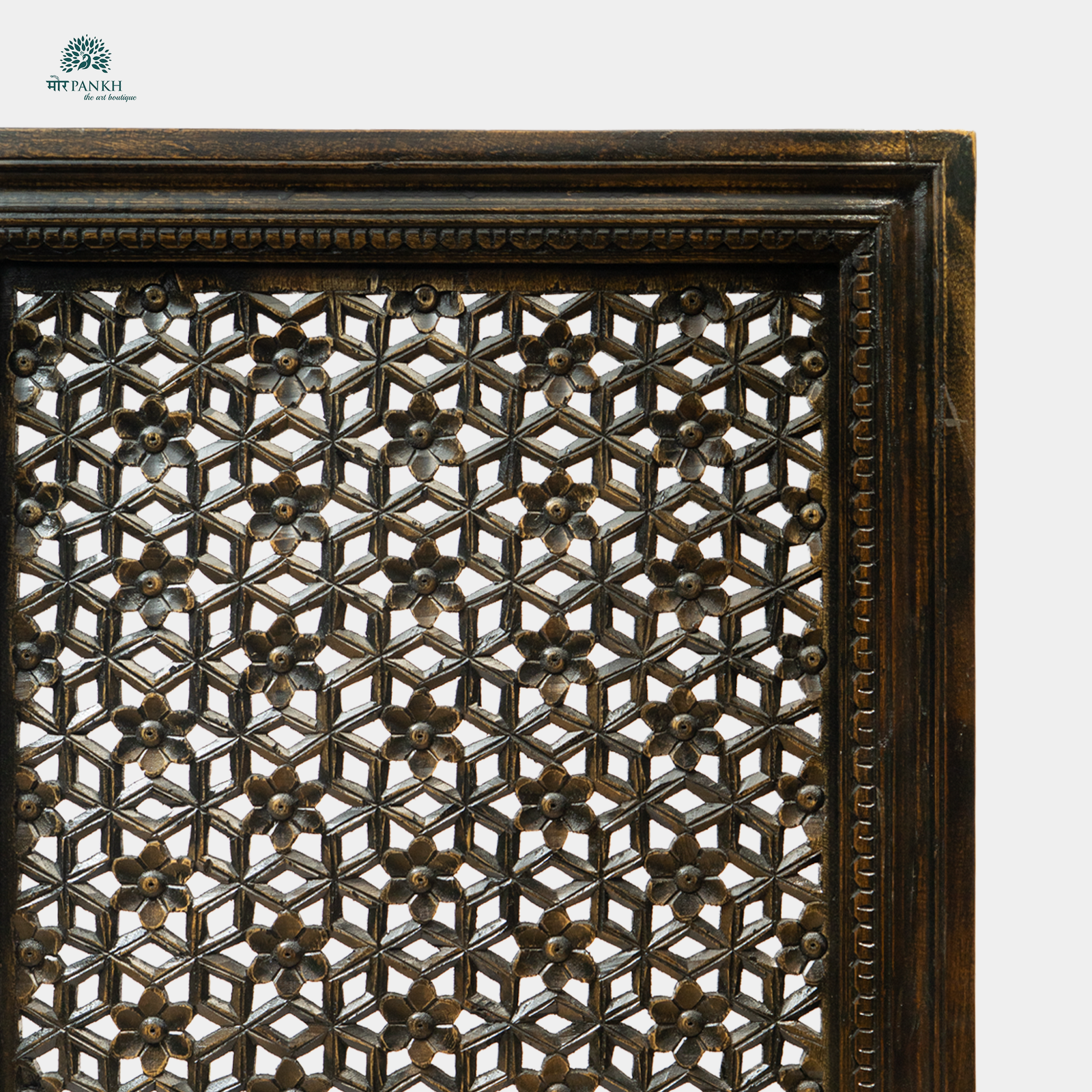 Step into a bygone era with this handcrafted arched jaali panel from Morpankh, where geometry meets soul. Inspired by the grandeur of Mughal architecture, its delicate latticework and aged finish echo the romance of ancient palaces. Accented with subtle colored inlays, this wall piece doesn’t just adorn a space — it transports it. Every cut, every curve, carved by hand — because at Morpankh, tradition isn’t replicated, it’s relived.