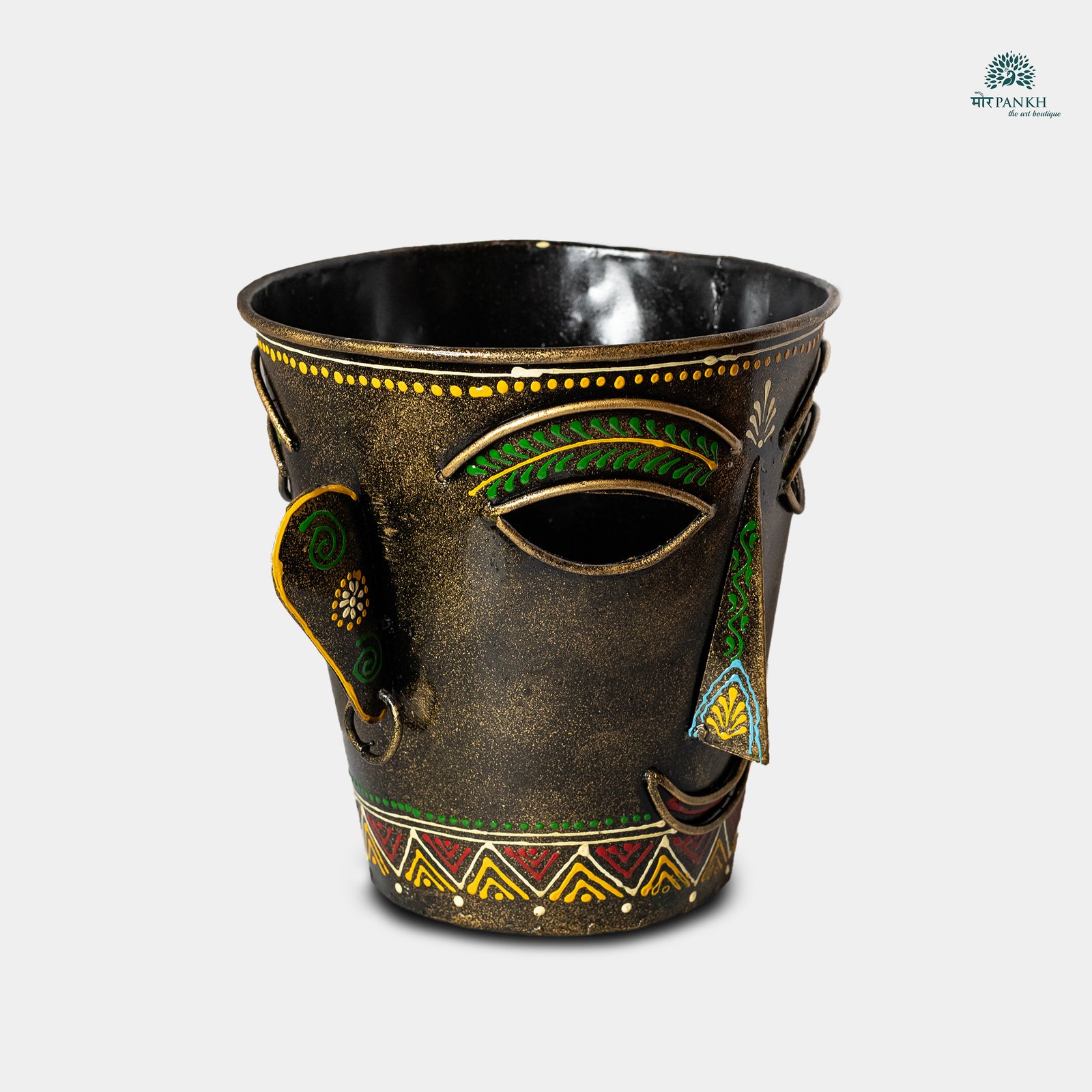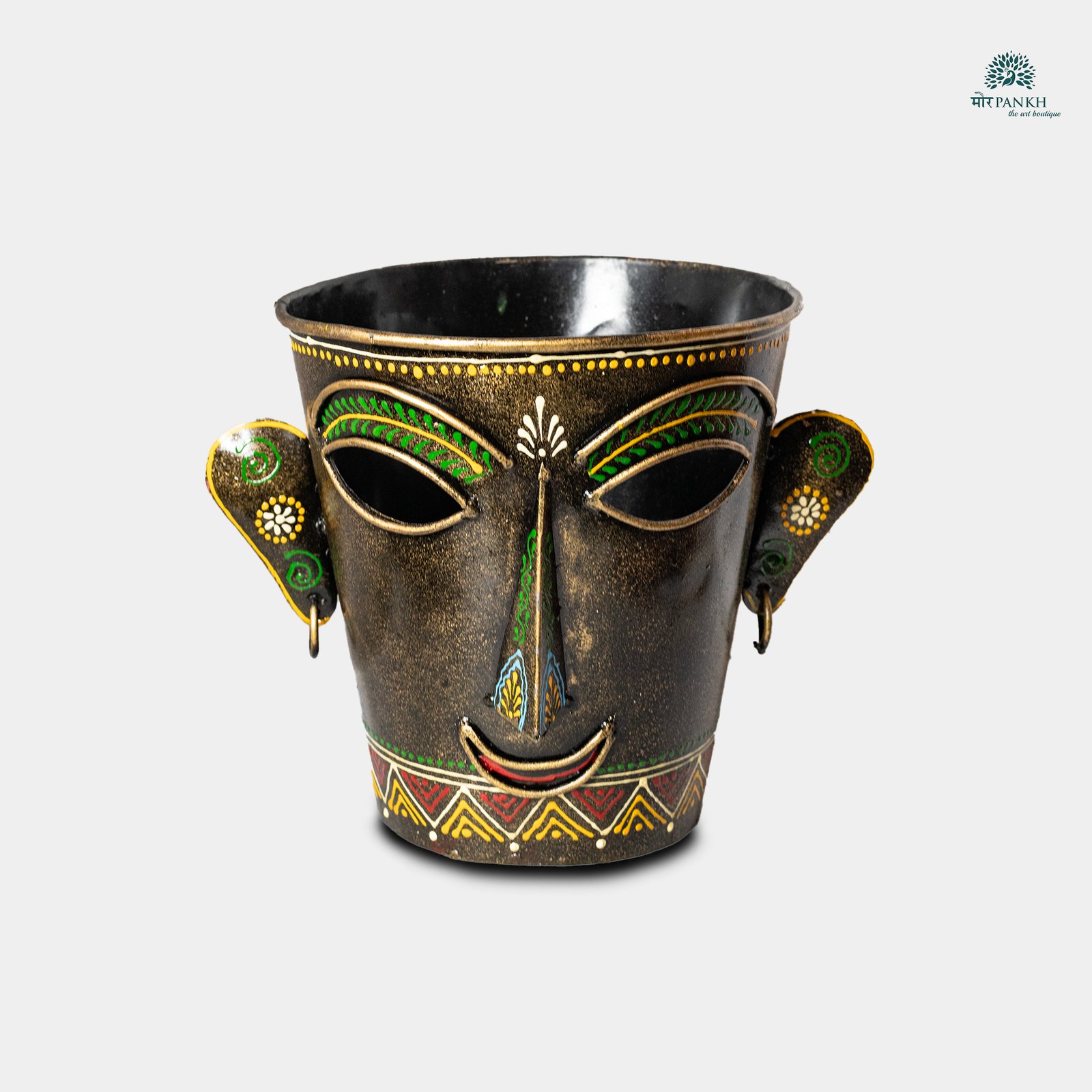 Add a touch of artistic flair to your gatherings with this handcrafted metal face bucket, designed for chilling wine, beer, or beverages. Featuring a striking tribal-inspired face design with intricate hand-painted details, this piece serves as both a functional cooler and a stunning décor element. The robust metal body ensures durability, while the rustic finish enhances its vintage charm.Perfect for home bars, parties, or as a unique gift for art lovers.