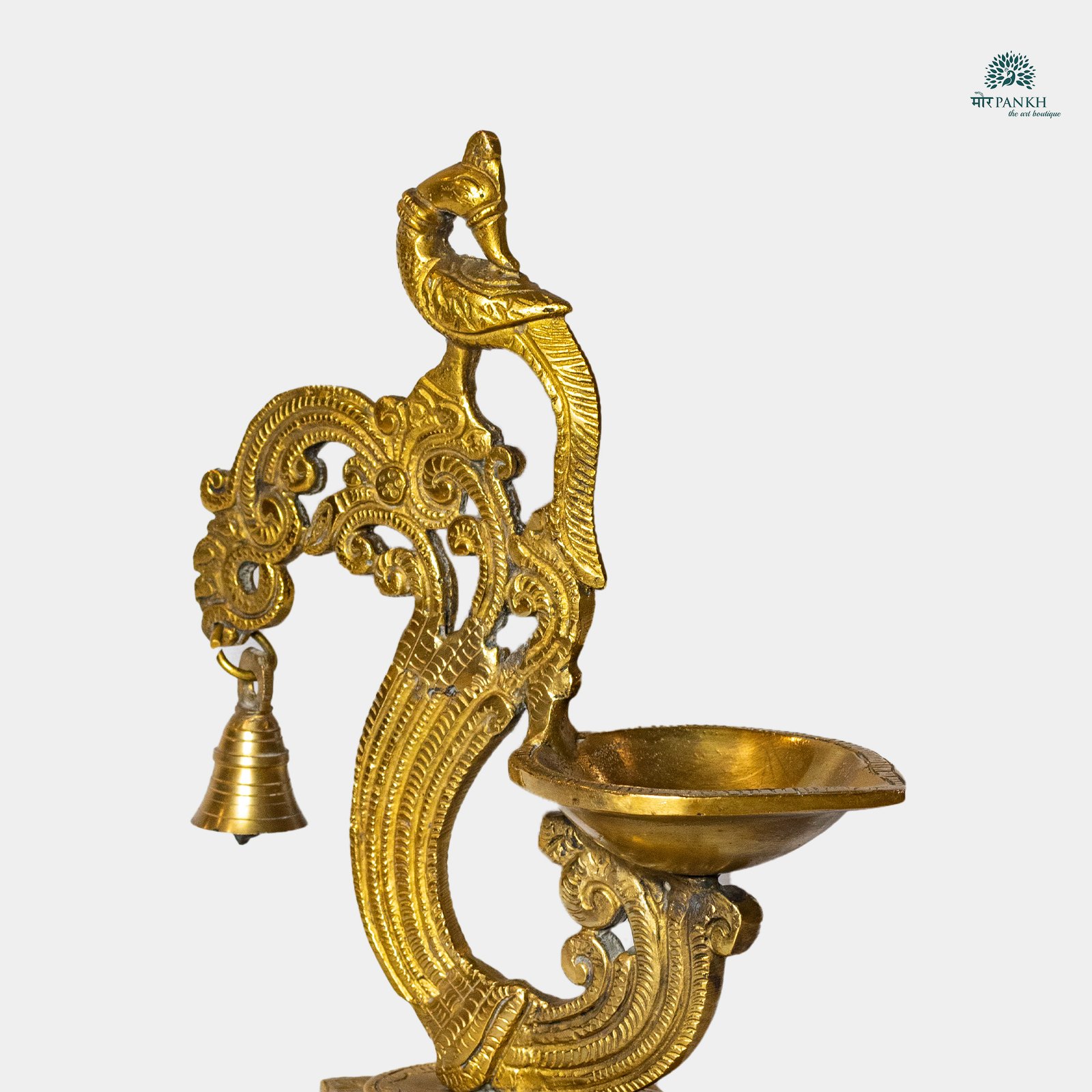 This exquisite brass diya from Morpankh showcases a graceful peacock design, symbolizing beauty and spirituality in Indian tradition. The diya stands elegantly on a raised, intricately carved base, adding a sense of grandeur and stability. A small hanging bell enhances the spiritual aura, perfect for daily rituals or festive décor. Entirely handcrafted by skilled artisans, it reflects timeless craftsmanship and devotion. A perfect blend of tradition and artistry, it brings charm and sacred warmth to any space.