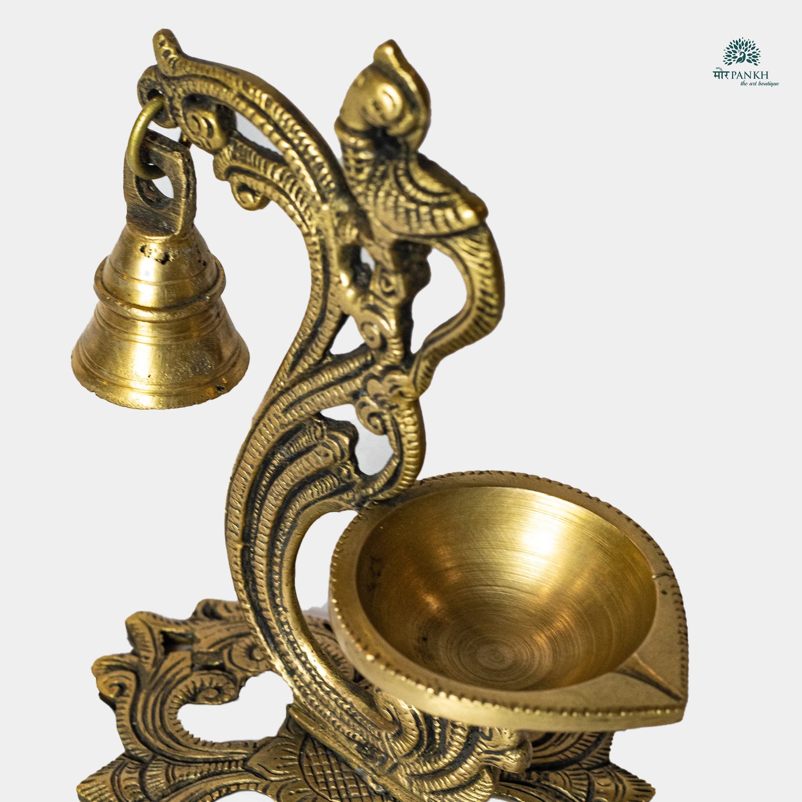 Elevate your spiritual space with this intricately handcrafted brass diya from Morpankh. Featuring a stunning peacock design and a traditional hanging bell, this piece reflects timeless Indian artistry and devotion. The detailed carvings and antique finish make it a beautiful addition to your pooja room or as a thoughtful gift. Crafted by skilled artisans, each piece carries a unique charm and cultural richness. Add warmth, light, and tradition to your home with this elegant creation.