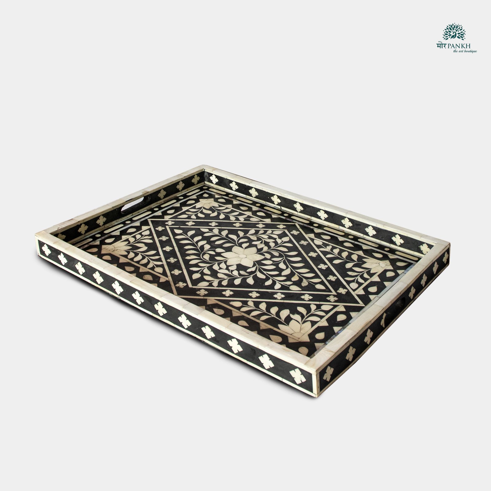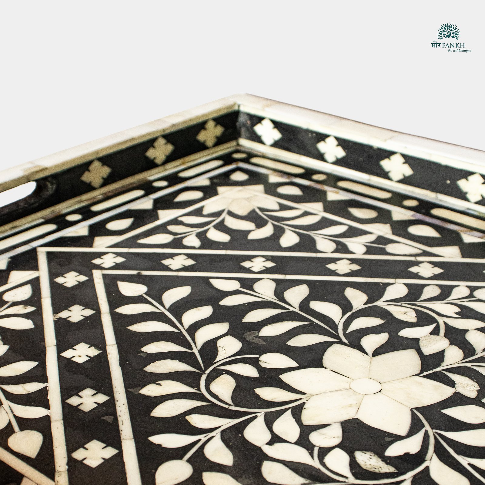 Elevate your décor with this striking handcrafted tray, featuring intricate mother-of-pearl inlay set against a bold black base. Each floral and geometric detail is carefully carved and laid by skilled artisans, making every piece one of a kind. Perfect as a serving tray or a decorative accent on coffee tables or consoles, it blends utility with timeless elegance. A true statement of craftsmanship and luxury.