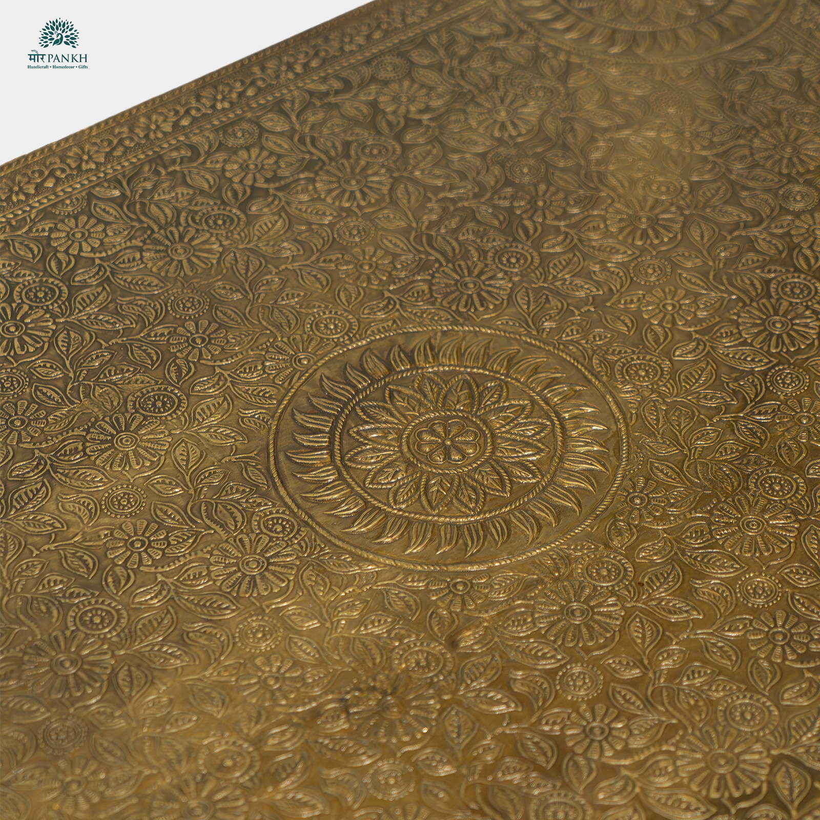 A masterpiece of traditional craftsmanship, this coffee table blends the richness of wood with the elegance of intricately embossed brass sheet work. The base features gracefully carved wooden swans, symbolizing beauty and grace, while the top is adorned with detailed floral engravings on brass. This luxurious center table is not just furniture but a statement of artistry, perfect for adding a regal touch to your living space.