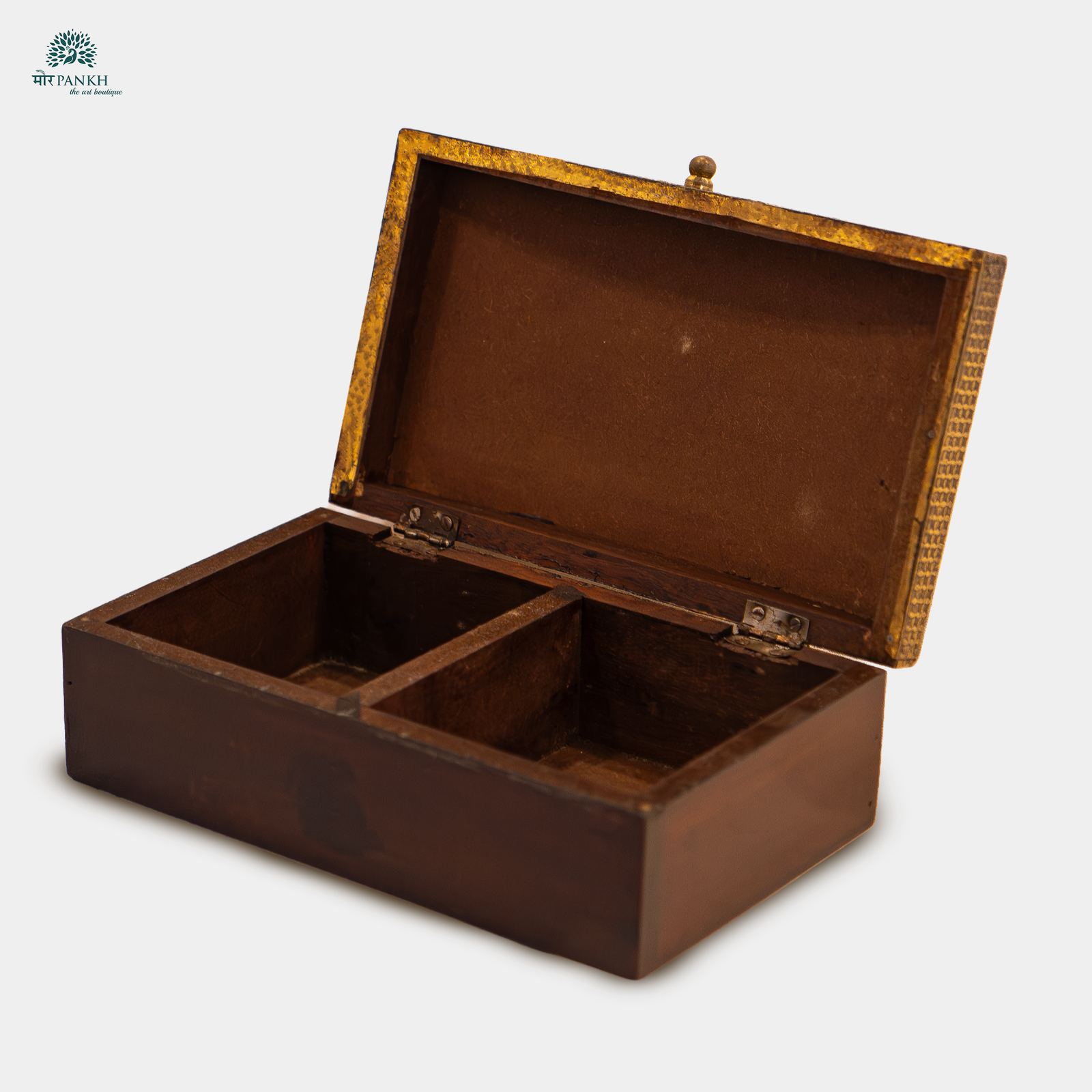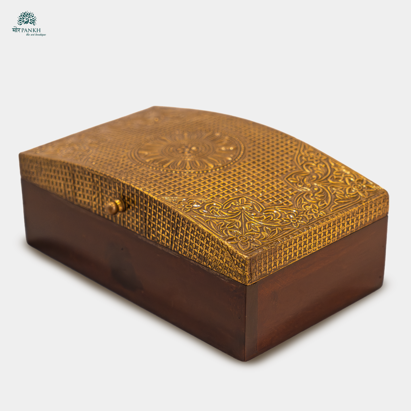 Add a touch of elegance to your home decor with this beautifully handcrafted wooden Jewellery box detailed with brass sheet embossing. The lid is adorned with an intricately embossed brass sheet, featuring a stunning floral and geometric pattern that enhances its vintage appeal. Blending style with functionality through two spacious compartments, this box is perfect for storing jewelry, keepsakes, trinkets, charms, or small accessories. The curved lid and antique-style knob add to its elegant charm, making a statement of grace, luxury, and timeless beauty. Ideal for personal use for safeguarding your most cherished accessories, or as a thoughtful gift for someone special.