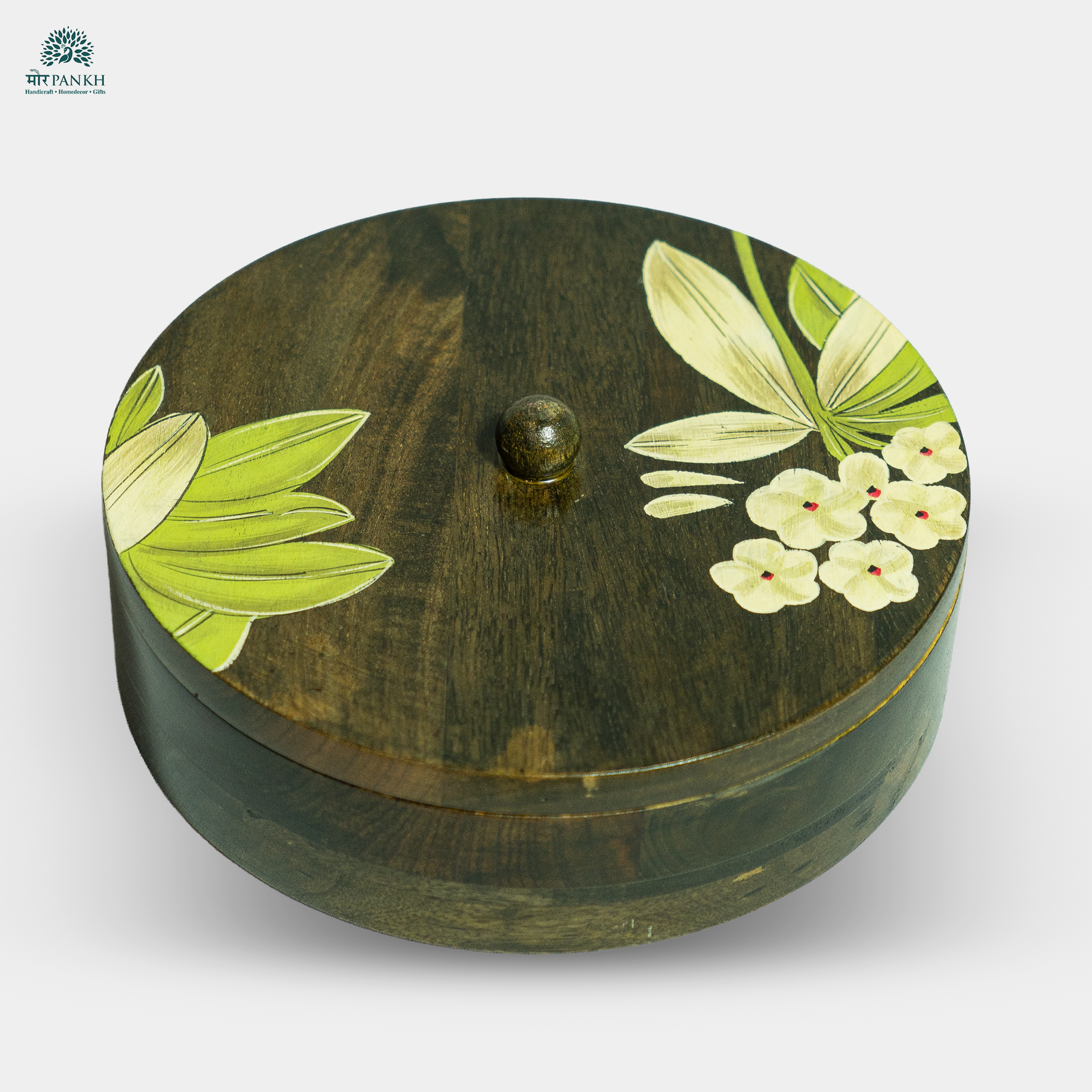 Keep your spices organized in this beautifully handcrafted wooden masala box, featuring a rich brown finish with delicate flower and leaf motifs.Designed for both functionality and elegance, it adds a traditional touch to your kitchen.With multiple compartments, it keeps your favourite spices fresh and accessible.A perfect blend of craftsmanship and utility, this Masala box is a must-have for every kitchen.