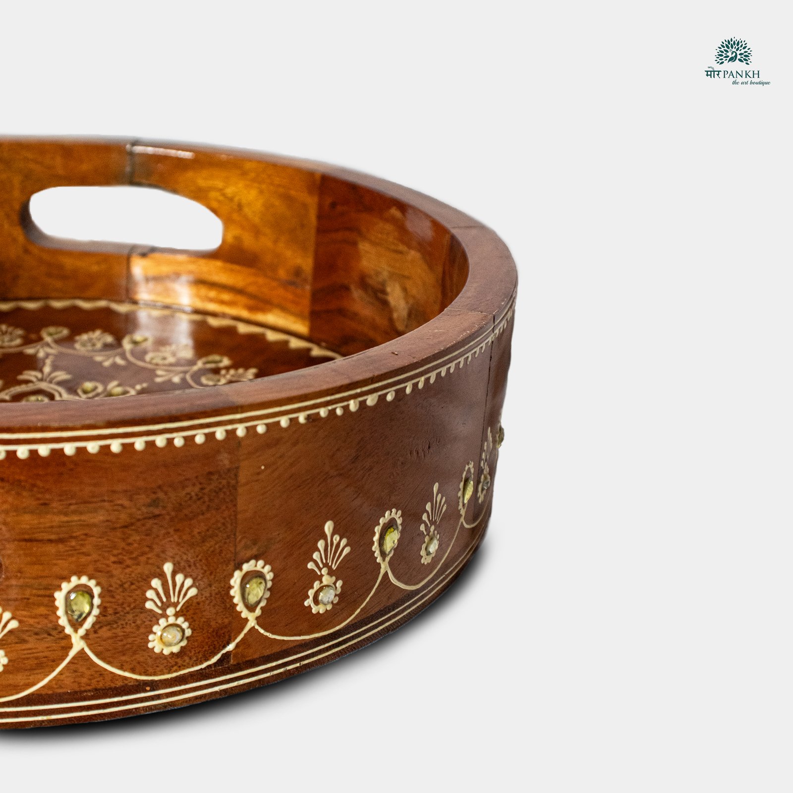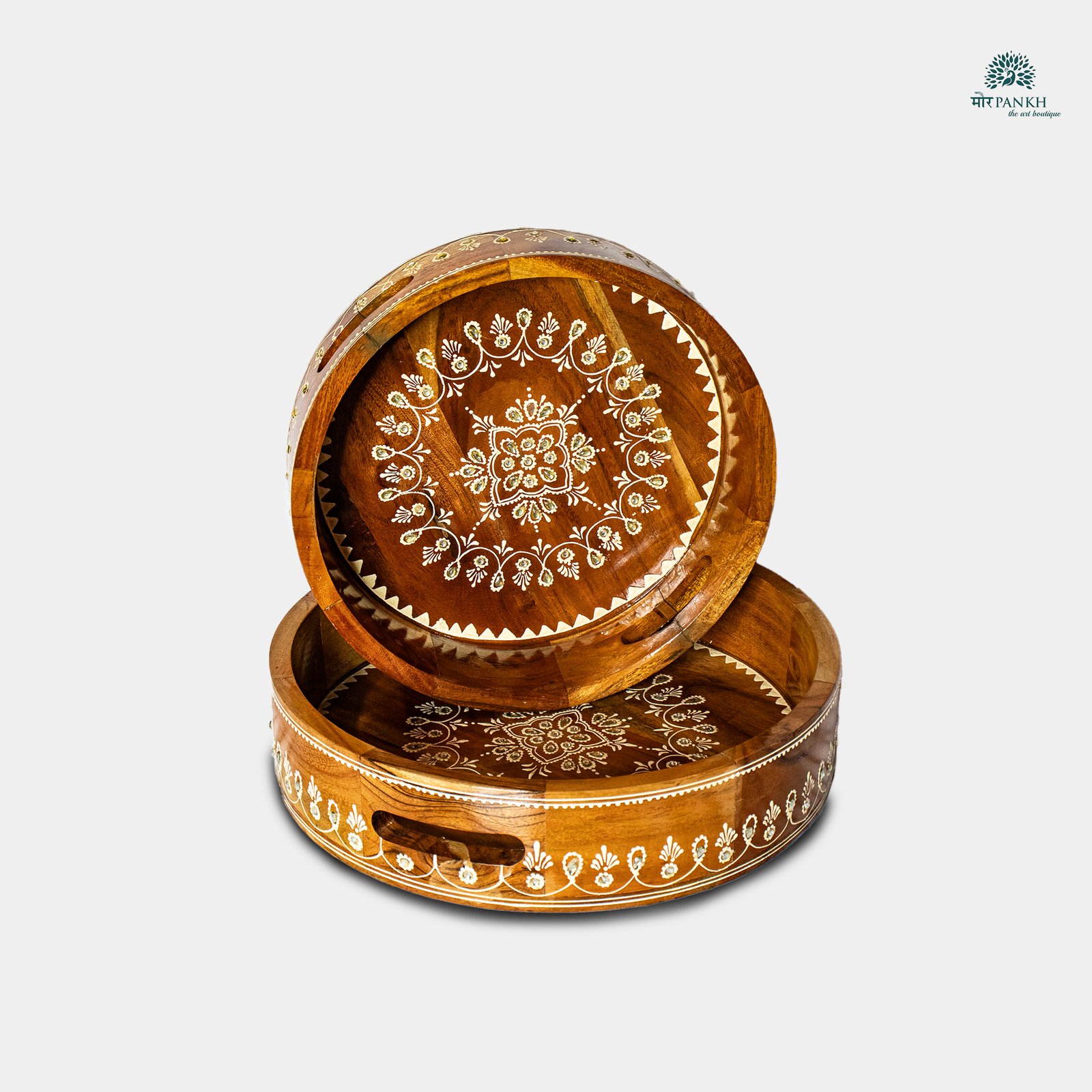Elevate your serving experience with this exquisite set of two handcrafted wooden trays by Morpankh. Each tray is delicately carved from premium wood and adorned with intricate, hand-painted mandala motifs in white, reflecting timeless Indian craftsmanship. The warm tones and fine detailing make them perfect for both everyday use and festive occasions. With smooth handles and sturdy build, they blend utility with elegance effortlessly. A celebration of tradition and artistry—crafted for the modern home.