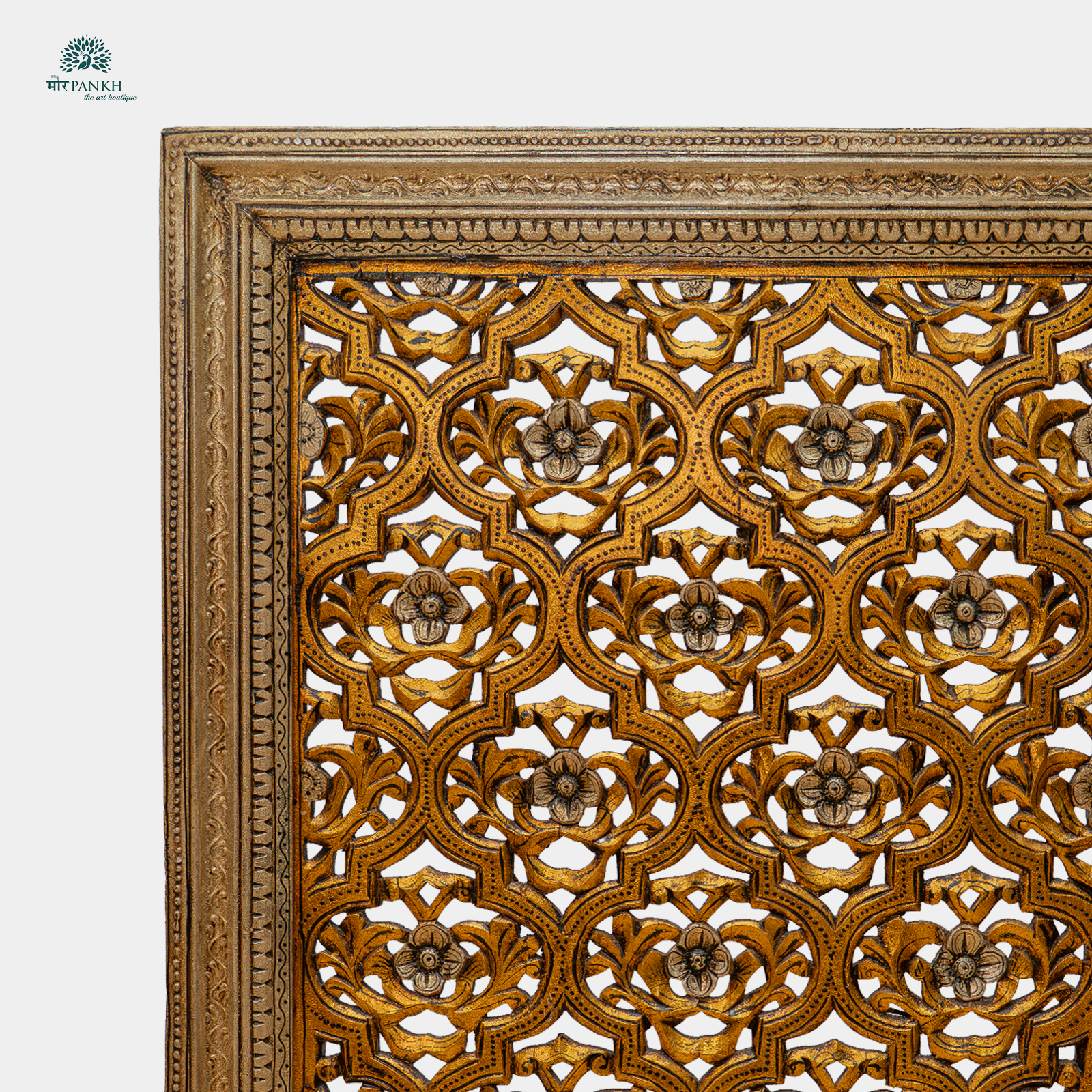 Bathed in gold and carved in tradition, this handcrafted wooden jaali panel with gold leaf detailing from Morpankh is pure grandeur. Each floral motif is sculpted with care and gilded by hand, turning this piece into a radiant tribute to royal artistry. Whether placed in a living room, hallway, or foyer, it transforms walls into galleries of timeless elegance. Let your space shimmer with heritage, handcrafted to perfection.