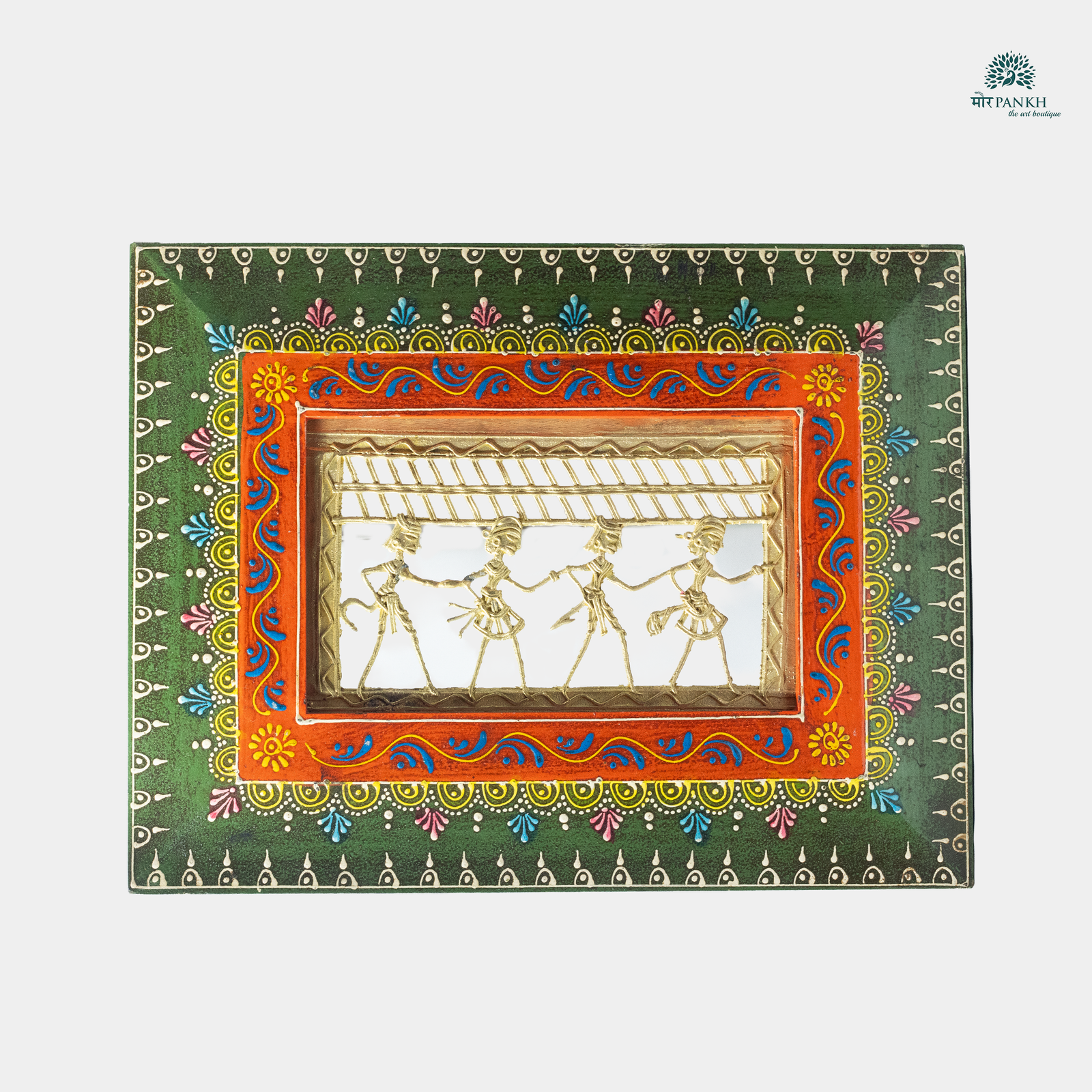 Add a splash of ethnic elegance to your space with this vibrant hand painted frame, centred with a traditional Dhokra brass jaali. Crafted using the ancient lost-wax casting method, the Dhokra motif lends an antique charm, while the colourful floral patterns on the wooden frame highlight India’s rich artisan traditions. Perfect as wall décor for living rooms, entryways, or gifting, these frames come in various sizes and vibrant colour options.
