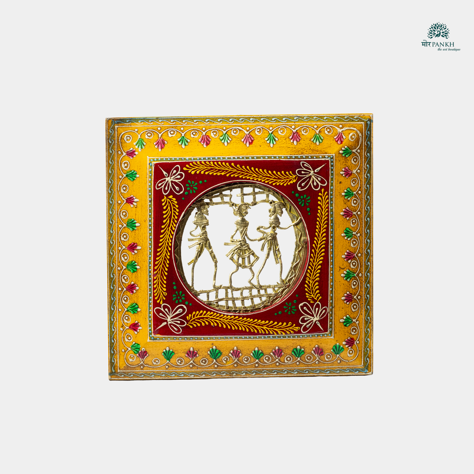 Add a splash of ethnic elegance to your space with this vibrant hand painted frame, centred with a traditional Dhokra brass jaali. Crafted using the ancient lost-wax casting method, the Dhokra motif lends an antique charm, while the colourful floral patterns on the wooden frame highlight India’s rich artisan traditions. Perfect as wall décor for living rooms, entryways, or gifting, these frames come in various sizes and vibrant colour options.