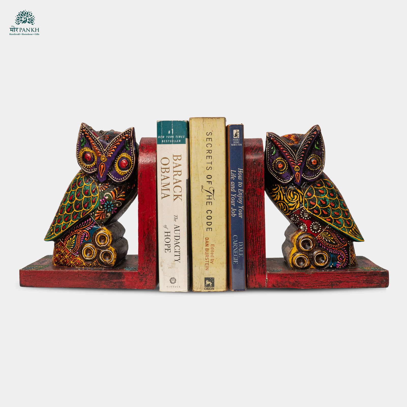 Elevate your bookshelf or side table with these exquisite wooden bookends featuring intricately hand-painted owls. Crafted by skilled artisans, and showcasing vibrant colors with traditional motifs, each piece is a perfect blend of functionality and artistic heritage. The detailed patterns and rich textures add a touch of elegance to any bookshelf or study space. Sturdy and durable, these bookends keep your collection organized while serving as a tasteful statement décor piece. Designed to hold your literary treasures in place, a perfect gift for book lovers and art enthusiasts alike!