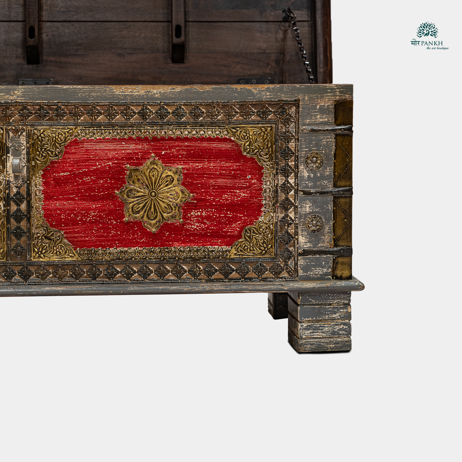This vibrant Sandook features a rich red finish contrasted with antique brass floral embossing, celebrating classic Indian craftsmanship. Handcrafted from seasoned wood, its bold design makes it a perfect accent for both traditional and eclectic interiors. It serves multiple purposes — from being a trousseau storage box to a statement bench, a coffee table, or even a TV console. A functional heirloom piece that adds timeless charm and cultural depth to any space.